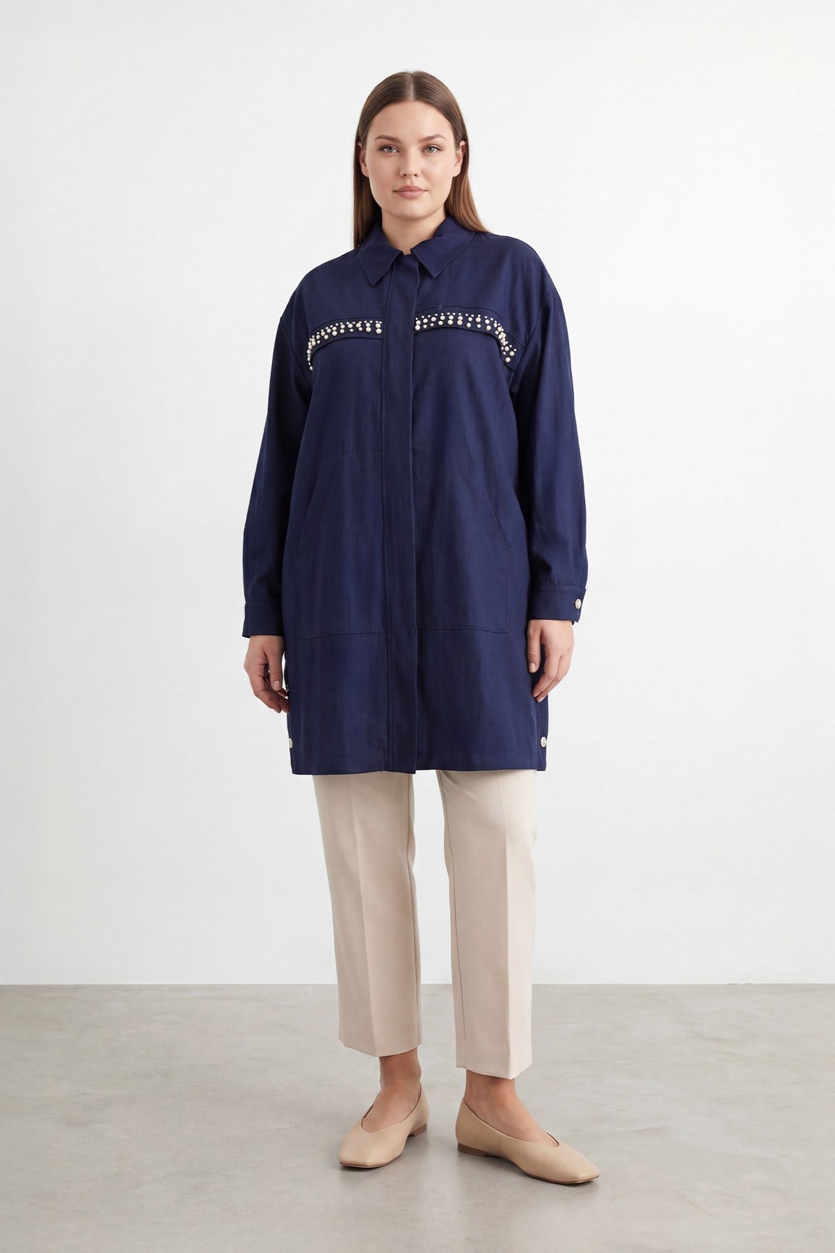 Kadın Taş Detaylı Büyük Beden Uzun Üst - 19263JCK - NAVY