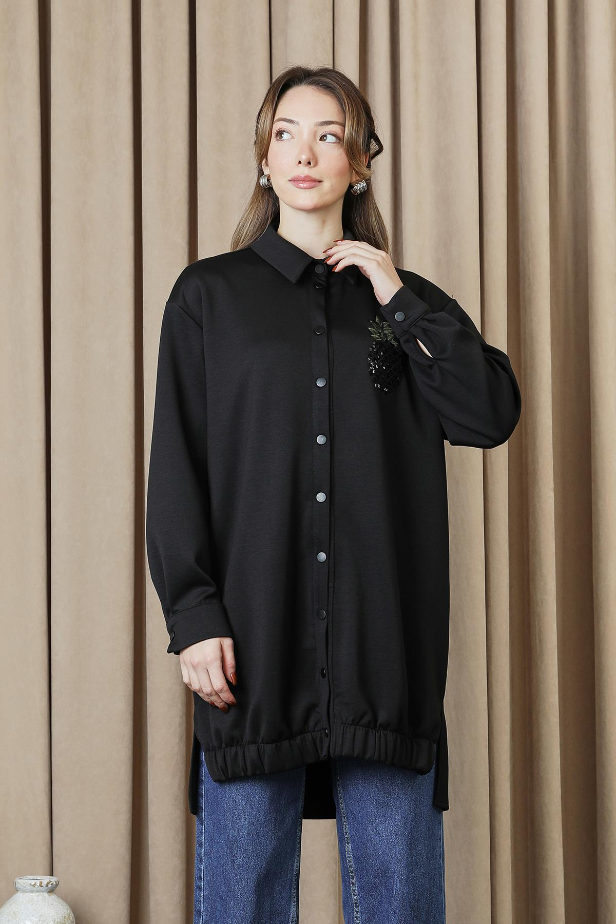 Kadın Ananas Nakışlı Çıtçıtlı Tunik - 10737TUN - BLACK