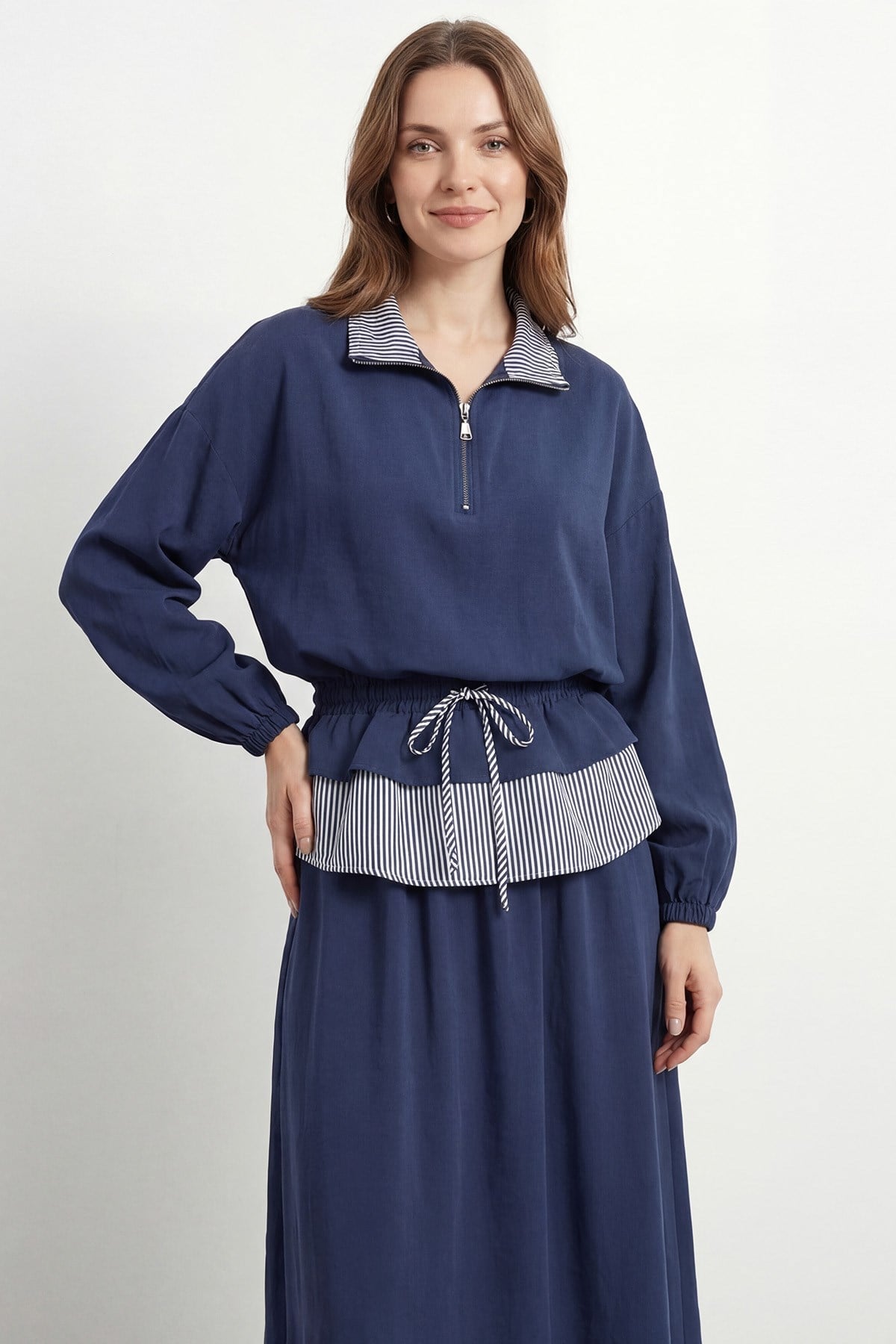 Kadın Çizgili Garni Detaylı Yarım Fermuarlı Takım – 32482TKS - NAVY