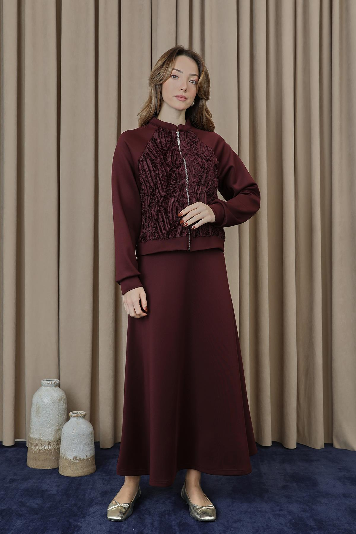 Kadın Dantel Detaylı Fermuarlı Ceket Takım - 14385TKS - BURGUNDY