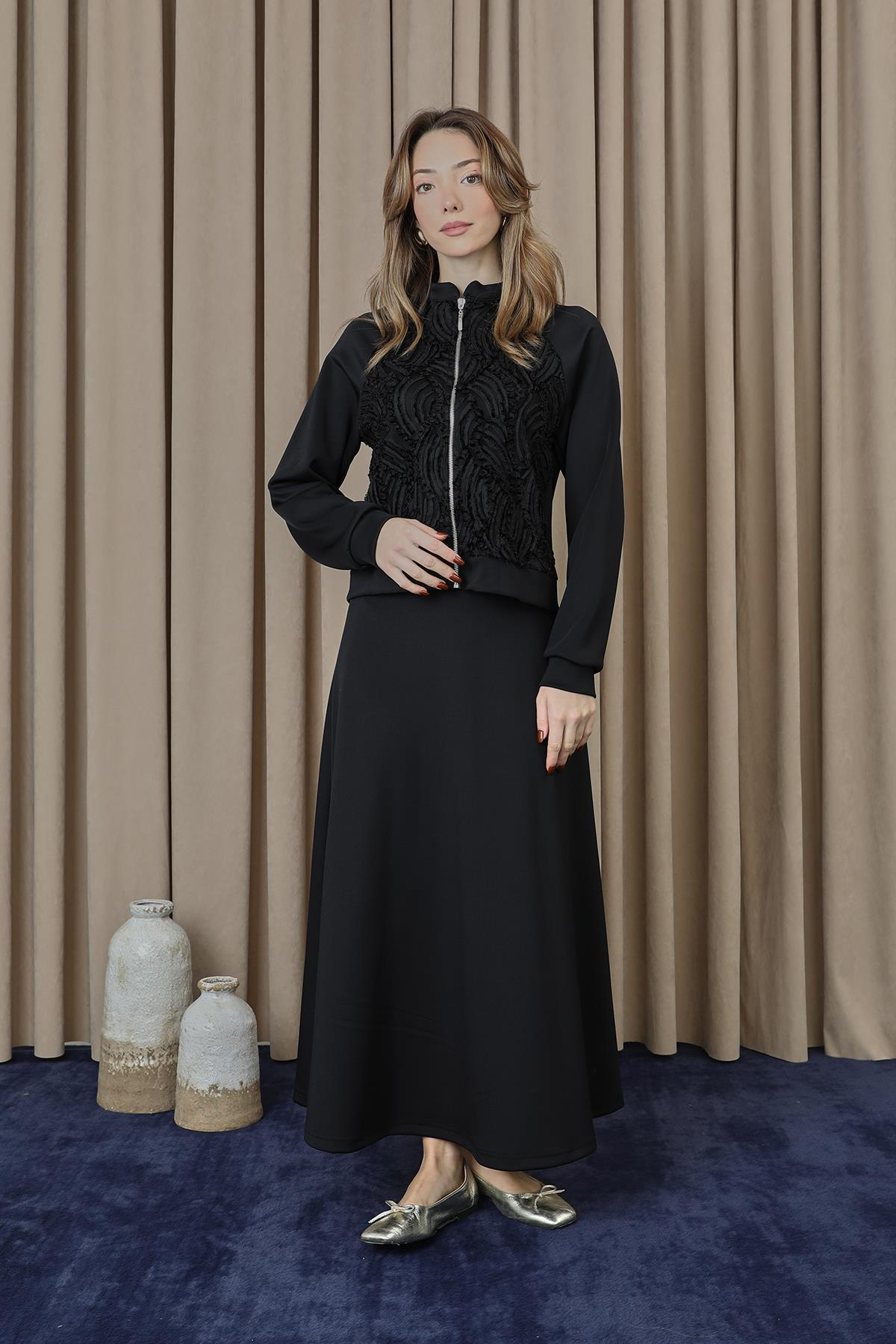 Açıklama : Dantel detaylarıyla zarif bir şıklık sunan bu fermuarlı ceket takım, modern ve feminen tasarımıyla öne çıkar. Rahat kesimi ve hafif kumaşı sayesinde gün boyu konfor sağlar, özel günlerden günlük kombinlere kadar uyum sağlar.