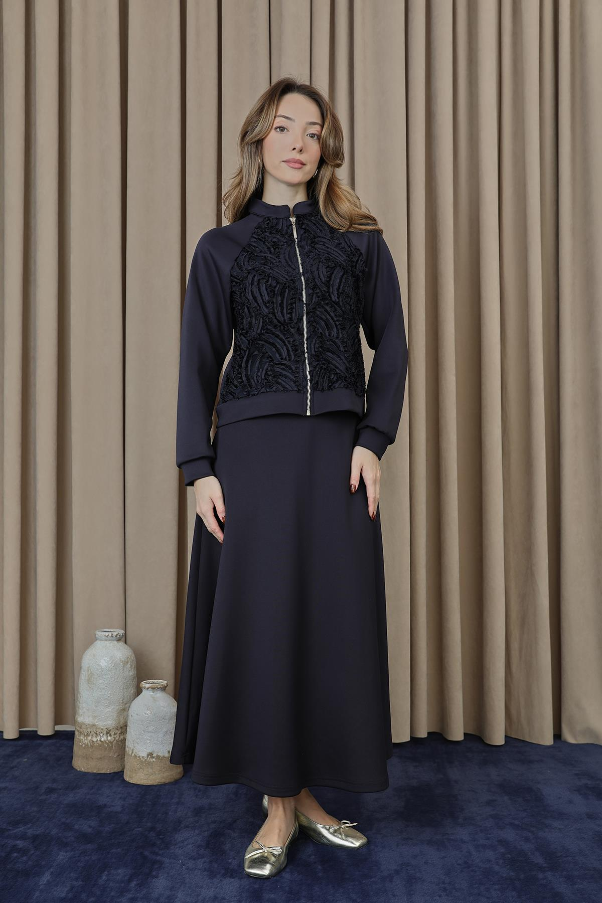 Kadın Dantel Detaylı Fermuarlı Ceket Takım - 14385TKS - NAVY