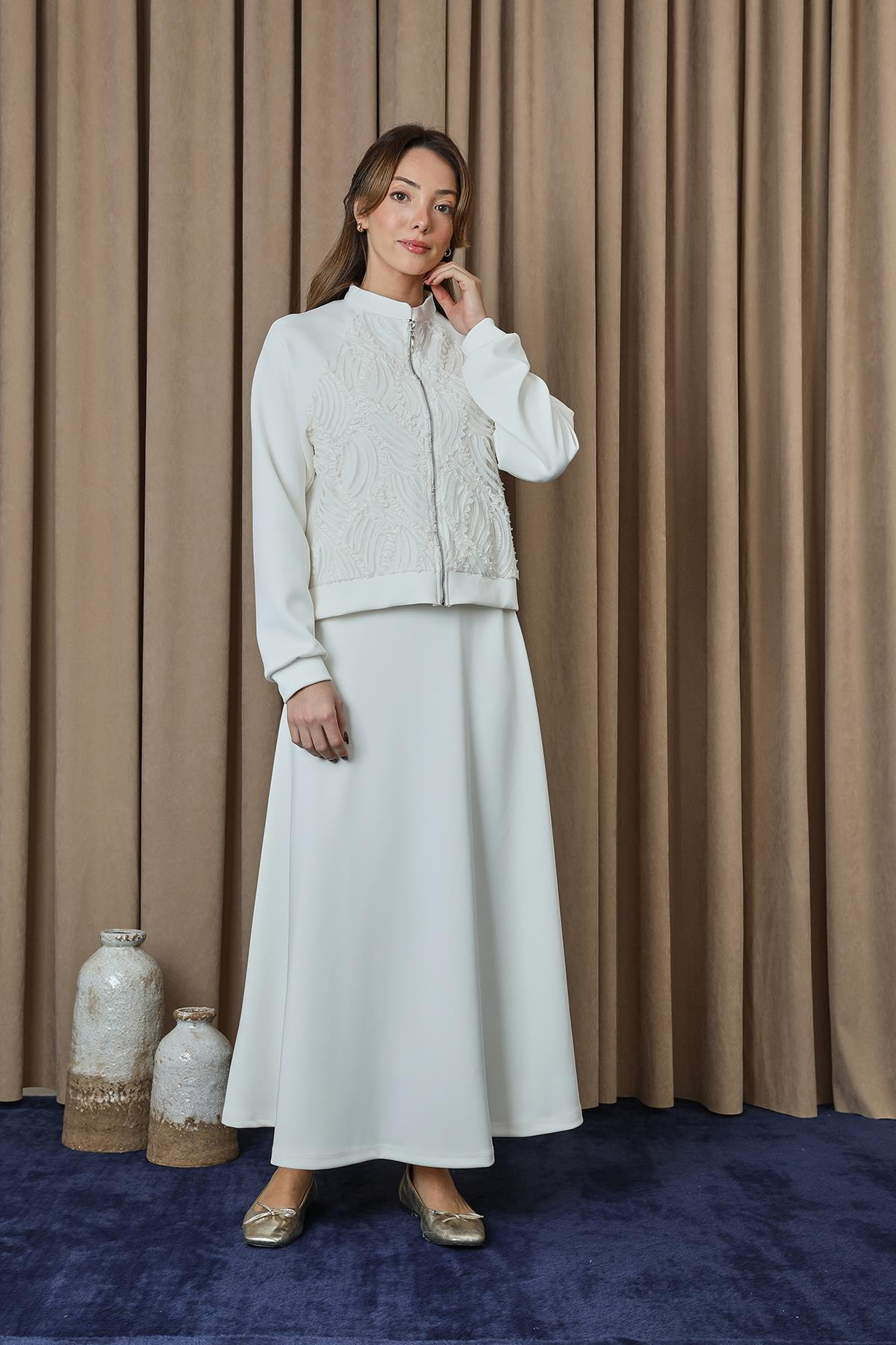 Açıklama : Dantel detaylarıyla zarif bir şıklık sunan bu fermuarlı ceket takım, modern ve feminen tasarımıyla öne çıkar. Rahat kesimi ve hafif kumaşı sayesinde gün boyu konfor sağlar, özel günlerden günlük kombinlere kadar uyum sağlar.