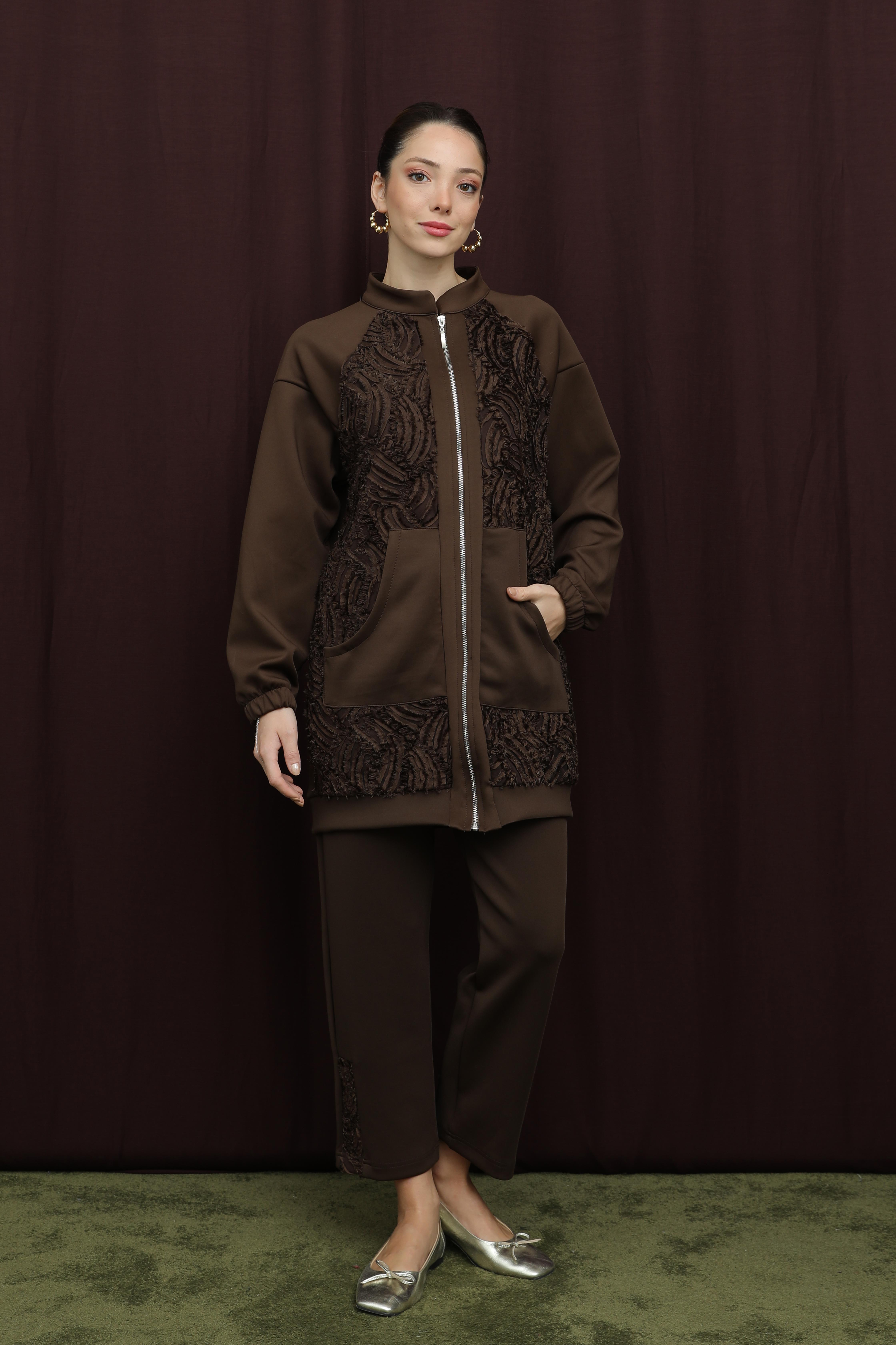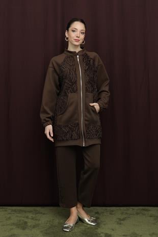 Kadın Dantel Detaylı Hakim Yakalı Fermuarlı Takım - 14387TKS - BROWN