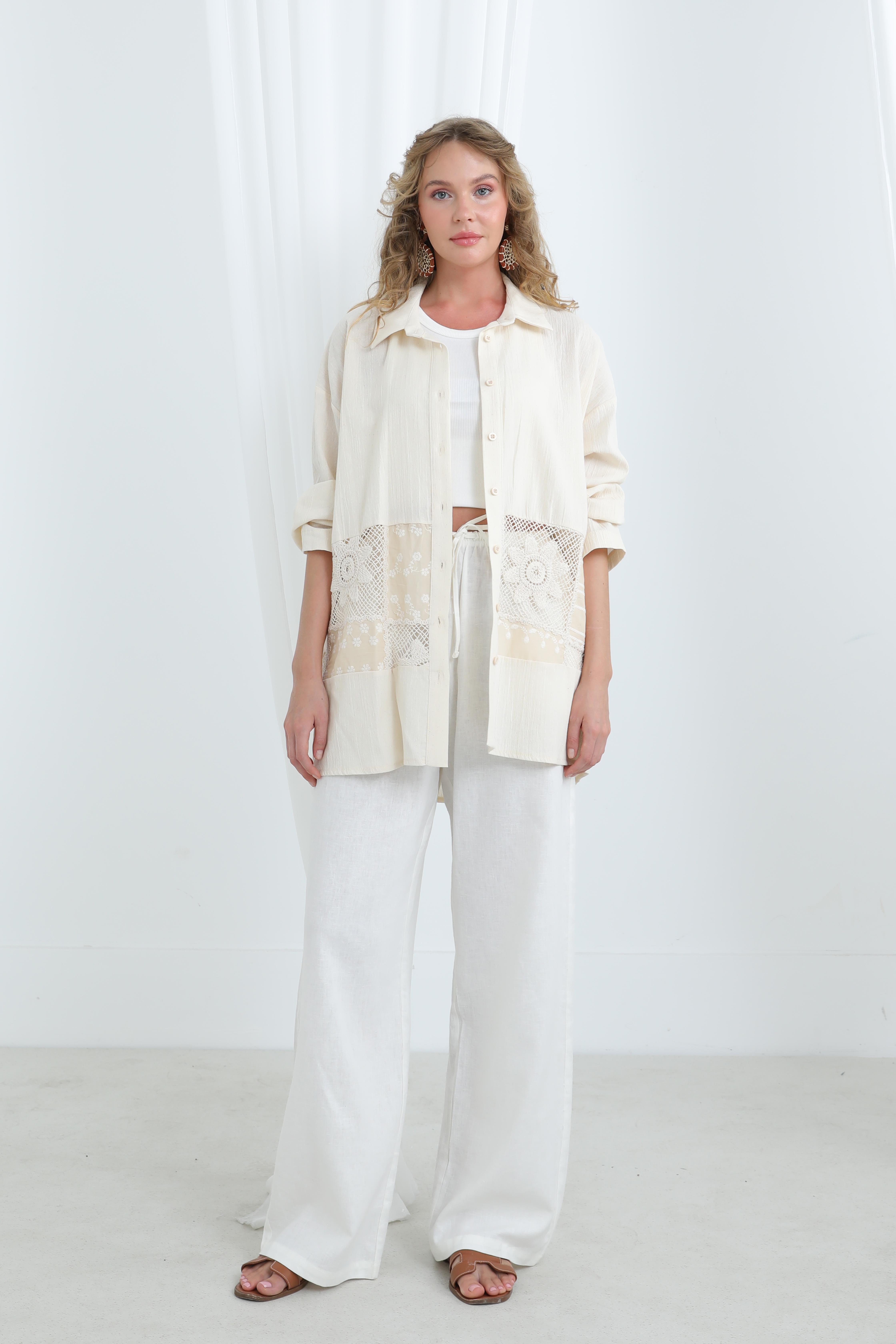 Açıklama :Rahat kalıbı ve dantel geçişli kol detaylarıyla hem feminen hem zarif bir tarz sunar. Tek cepli tasarımı ve hafif dokusu sayesinde günlük şıklık için ideal bir seçimdir. Mevsim geçişlerinde kat kat giyime de uygundur.