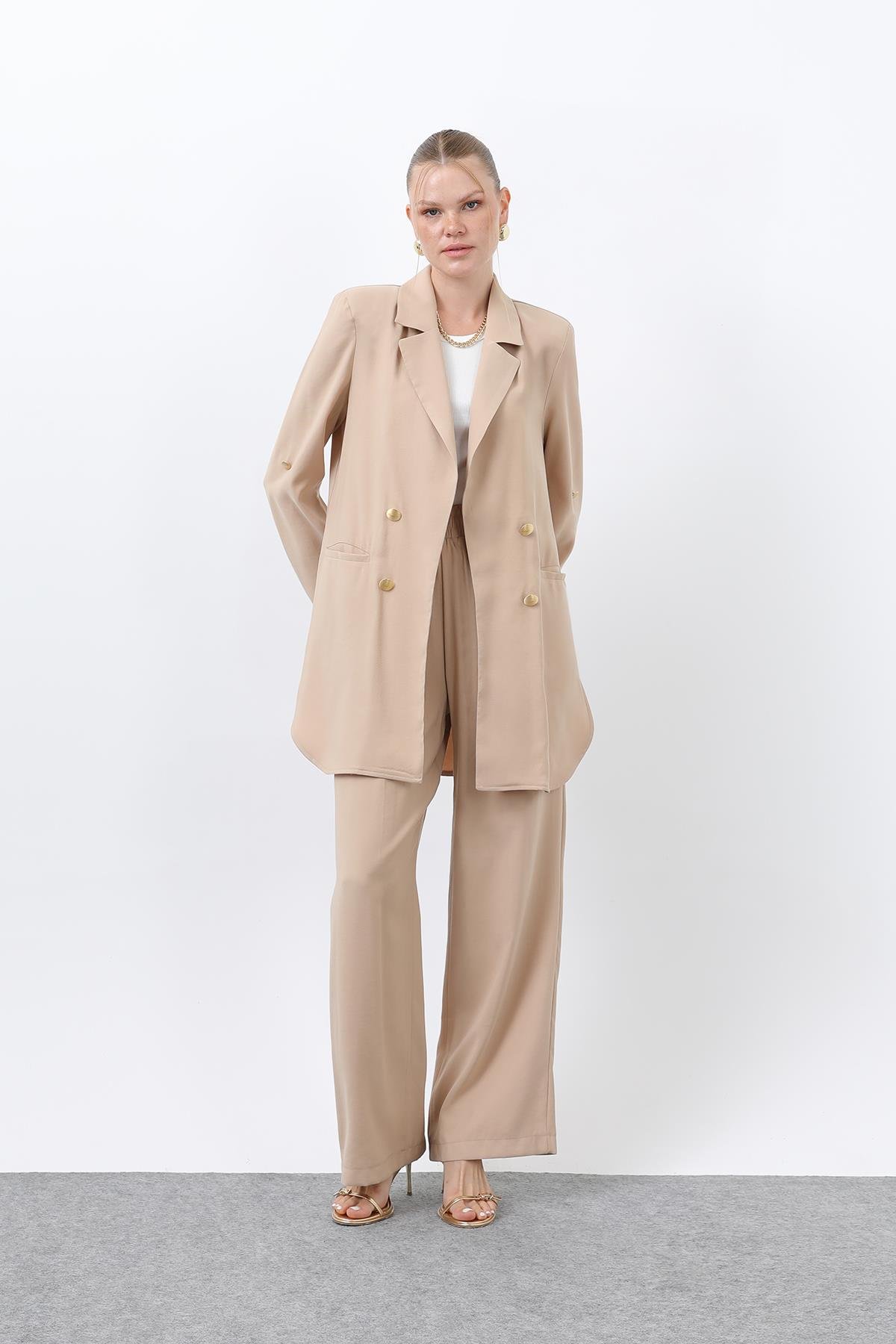 Kadın Düğme Detaylı Pantolonlu Blazer Ceket Takım - 14321TKM - STONE Kadın Düğme Detaylı Pantolonlu Blazer Ceket Takım - 14321TKM - CAMEL