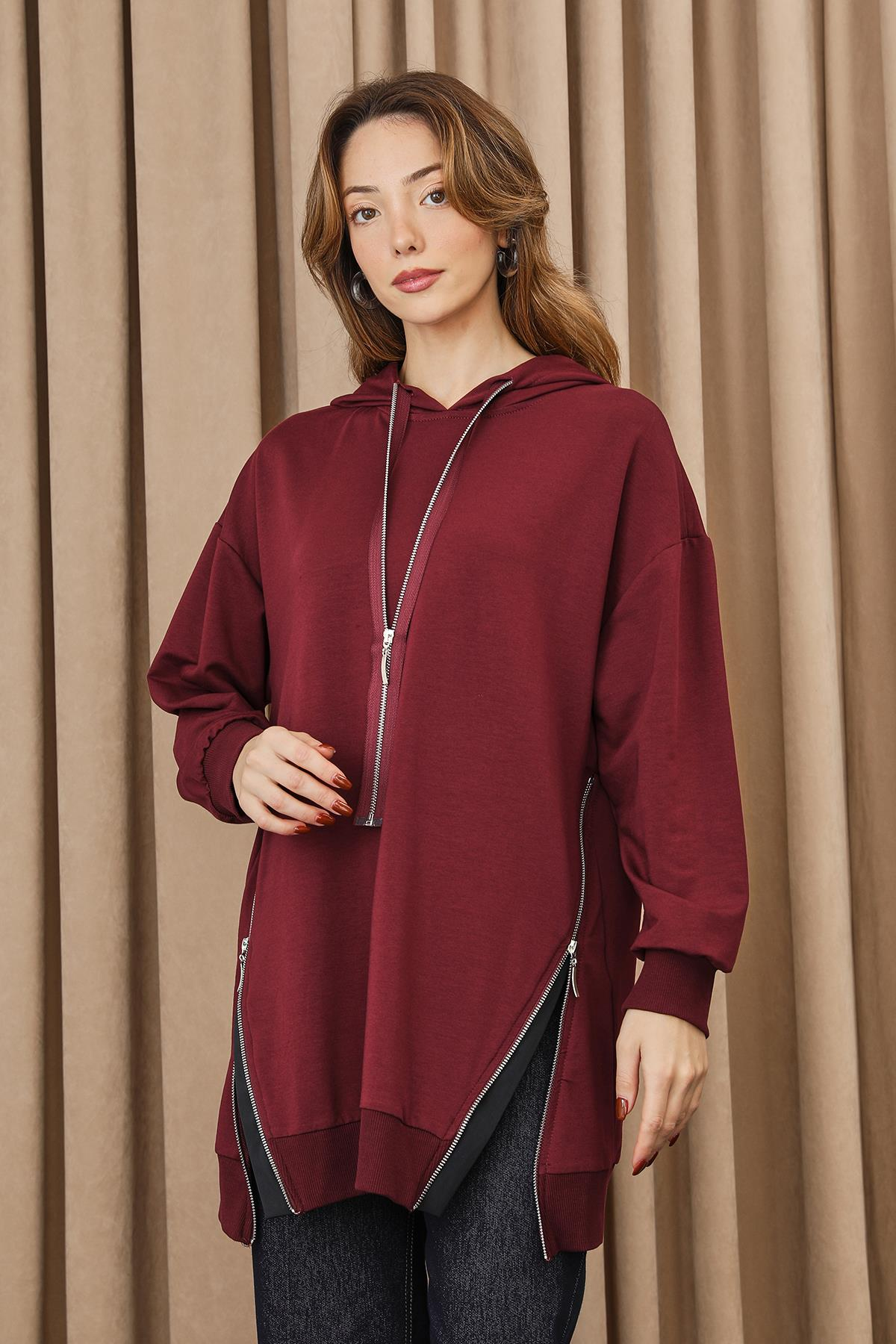 Kadın Fermuar Detaylı Tunik - 10731TUN - BURGUNDY-BLACK