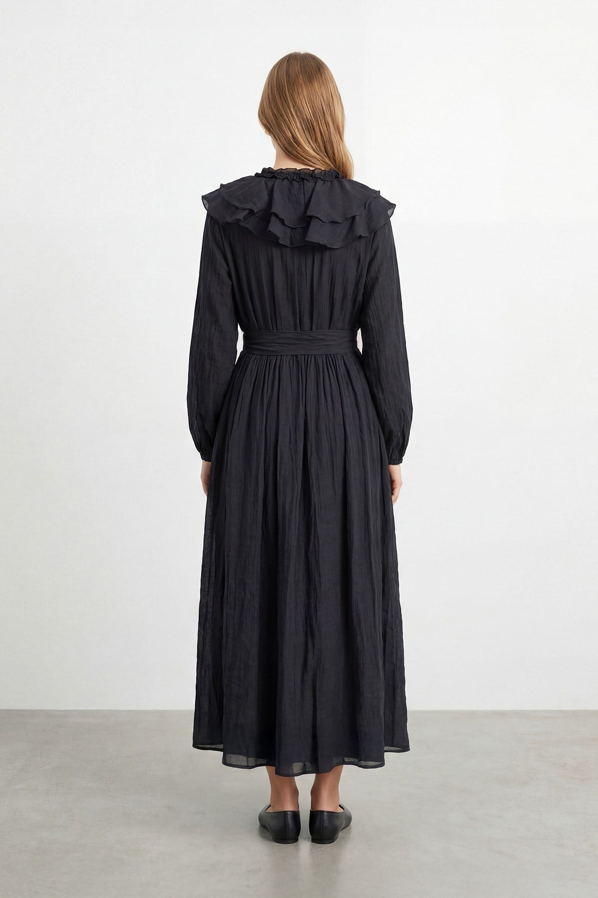 Kadın Fırfır Yakalı Kuşaklı Elbise - 32488ELB - BLACK