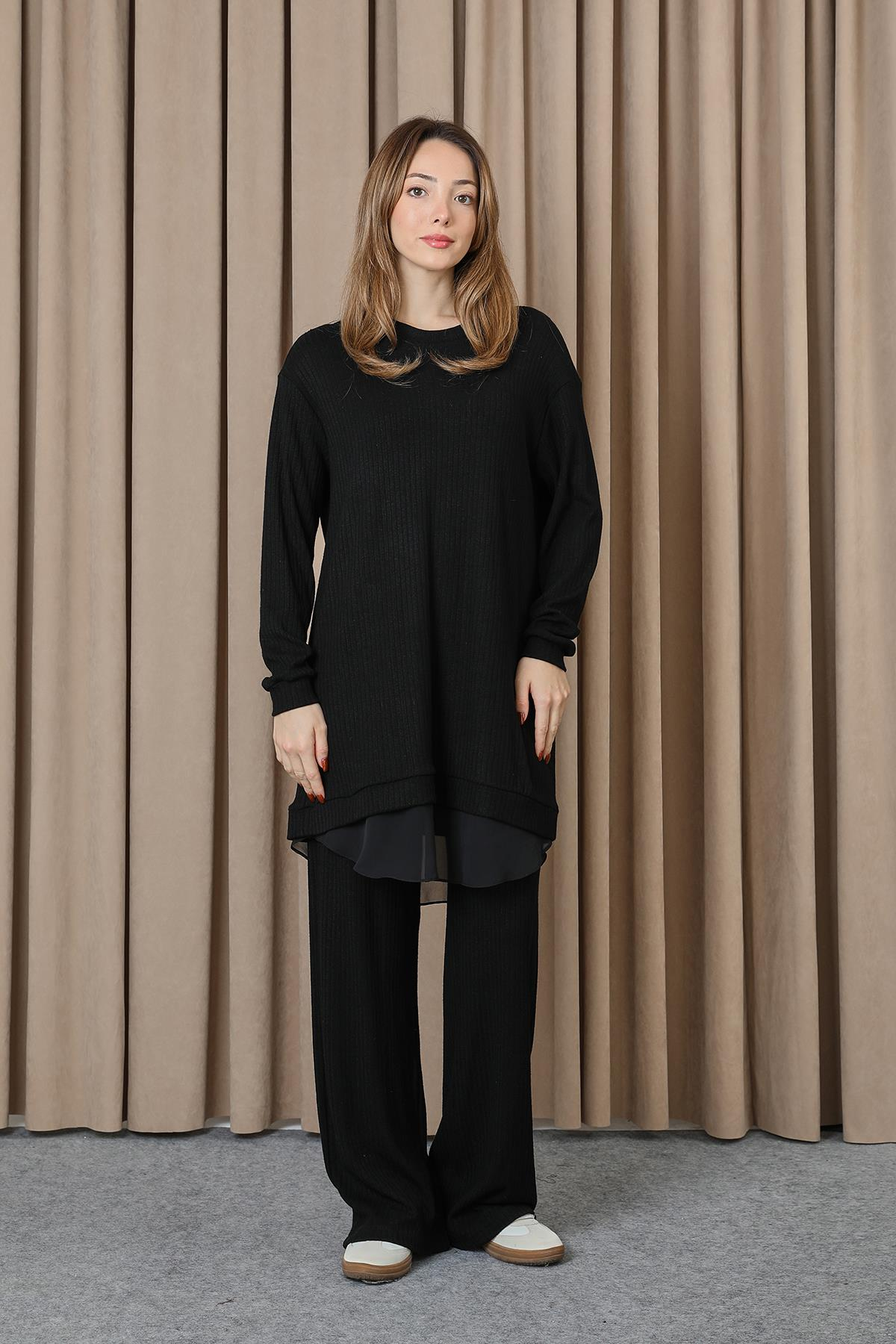 Kadın Kaşkorse Triko Görünümlü Şifon Detaylı Takım - 14401TKM - BLACK