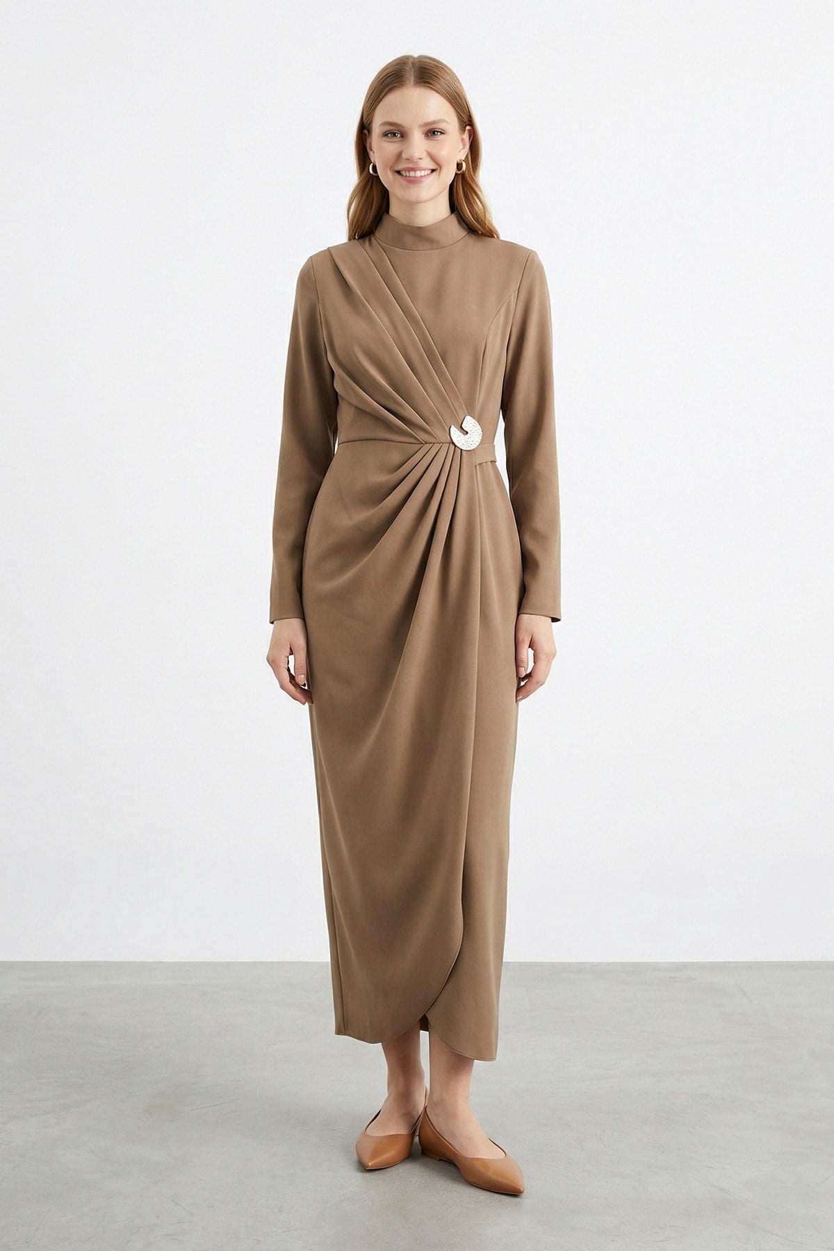 Kadın Kruvaze Görünümlü Toka Detaylı Uzun Elbise -12678ELB - MINK