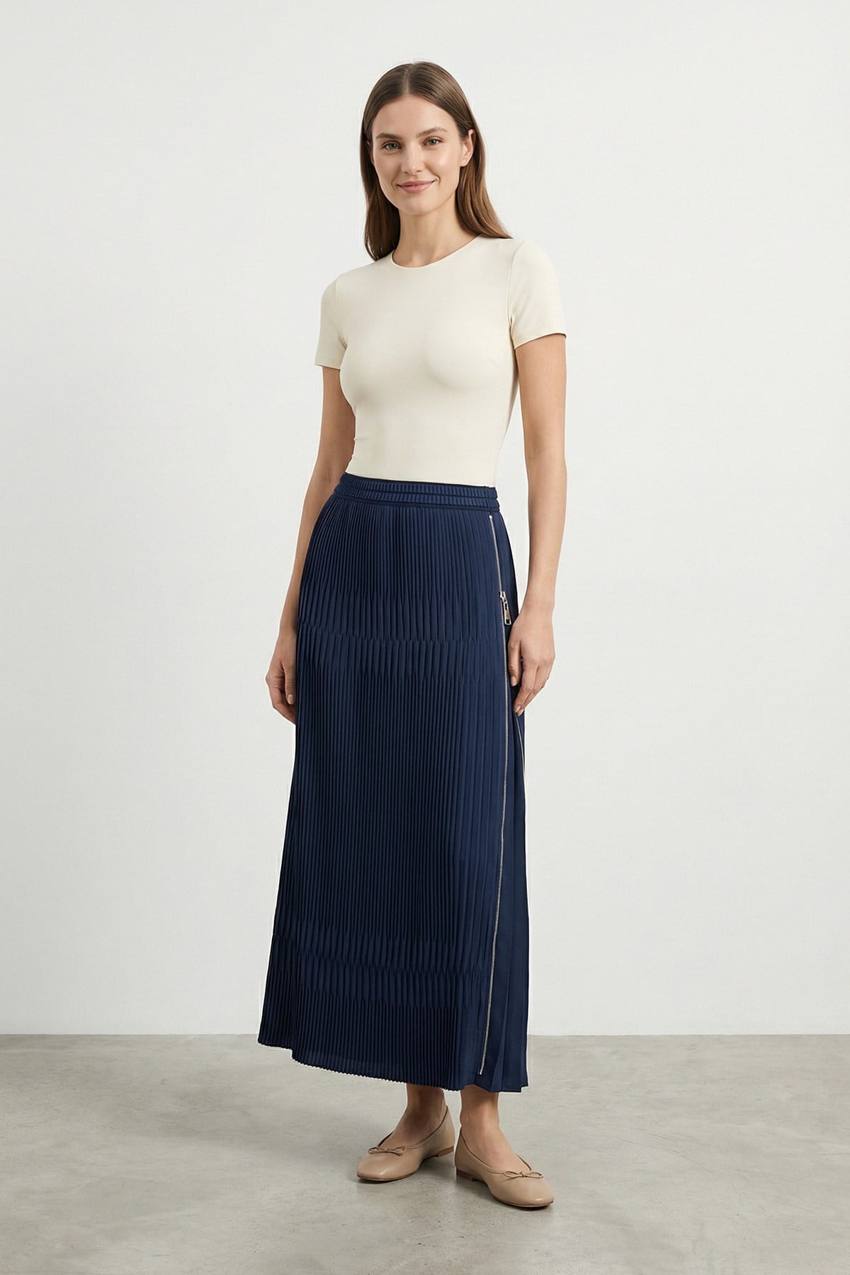 Kadın Pileli Yırtmaç Detaylı Uzun Etek – 18303ETK - NAVY