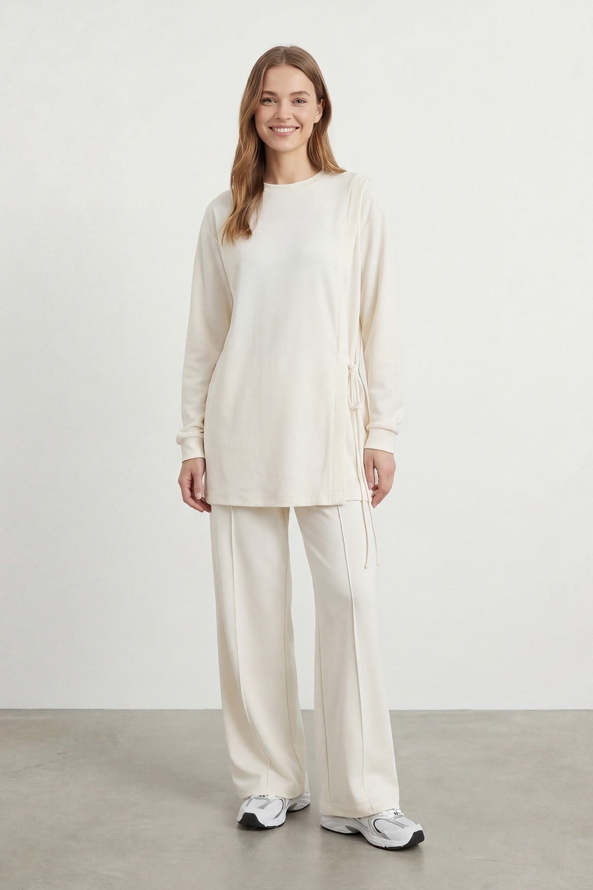 Kadın Yan Bağlama Detaylı Bisiklet Yaka Tunik Pantolon Takım – 14479TKS - ECRU