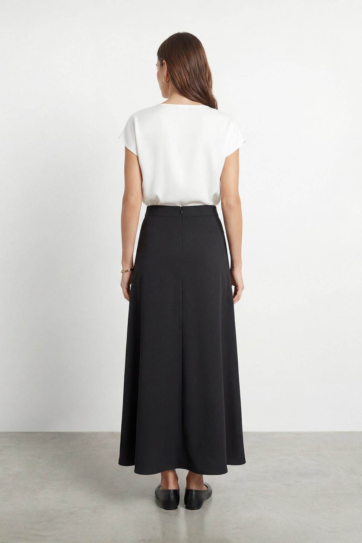 Açıklama : Gardırobunuzun en joker parçası olmaya aday bu maksi etek, şıklığı zahmetsiz bir konforla birleştiriyor. Belden aşağıya doğru süzülen yumuşak dökümü ve çan kesimi, her adımınızda size eşsiz bir hareket özgürlüğü sağlarken, aynı zamanda asil bir silüet oluşturur.